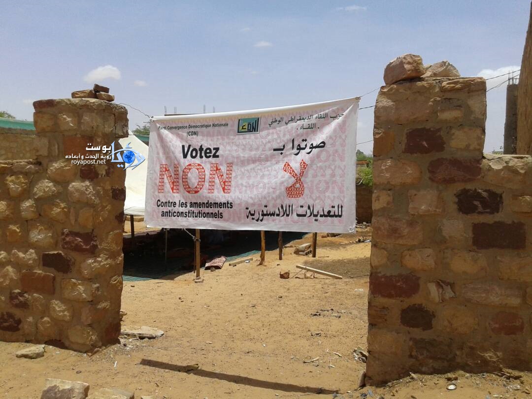 رؤيا بوست: قال محمدو ولد محمد المختار منسق حملة حزب اللقاء الديمقراطي المناهضة لتعديل الدستور بمدينة لعيون أن جهات أمنية وجهت له تهديدات بضرورة عدم الاستمرار في نشاط معارض لتعديل الدستور، وأضاف في تصريح لمراسل رؤيا بوست بالمدينة:”..حضر أفراد في سيارتين مدنيتين و يرتدون زيا مدنيا لمقر الحملة الليلة البارحة حيث كنا نستعد لعقد مهرجان شعبي مناهض للتعديلات، وأراد هؤلاء الأشخاص اصطحاب بعض الشباب النشطين في الحملة واخرج عدد من الأصفاد، إلا أنني اخبرتهم أنني هو المسؤول عن المقر حيث تم توقيفي حتى نهاية المهرجان ومنعنا من توزيع مناشير مناهضة لتعديل الدستور”