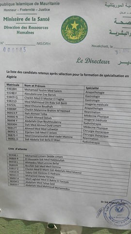 رؤيا بوست: حصل 14 طبيبا موريتانيا من تخصصات مختلفة على منحة للدراسات العليا في الجزائر، وتأتي المنحة في إطار الاتفاقيات الموقعة مؤخرا بين الحكومية الجزائرية والموريتانية وقد حصلت رؤيا بوست على لائحة الاطباء الممنوحين وكذا لائحة الانتظار التي ضمت 10 أطباء، وقد جاء اختيار الممنوحين من قبل لجنة تضم عشرة مسؤولين بوزارة الصحة تم تشكيلها من قبل الأمين العام للوزارة.