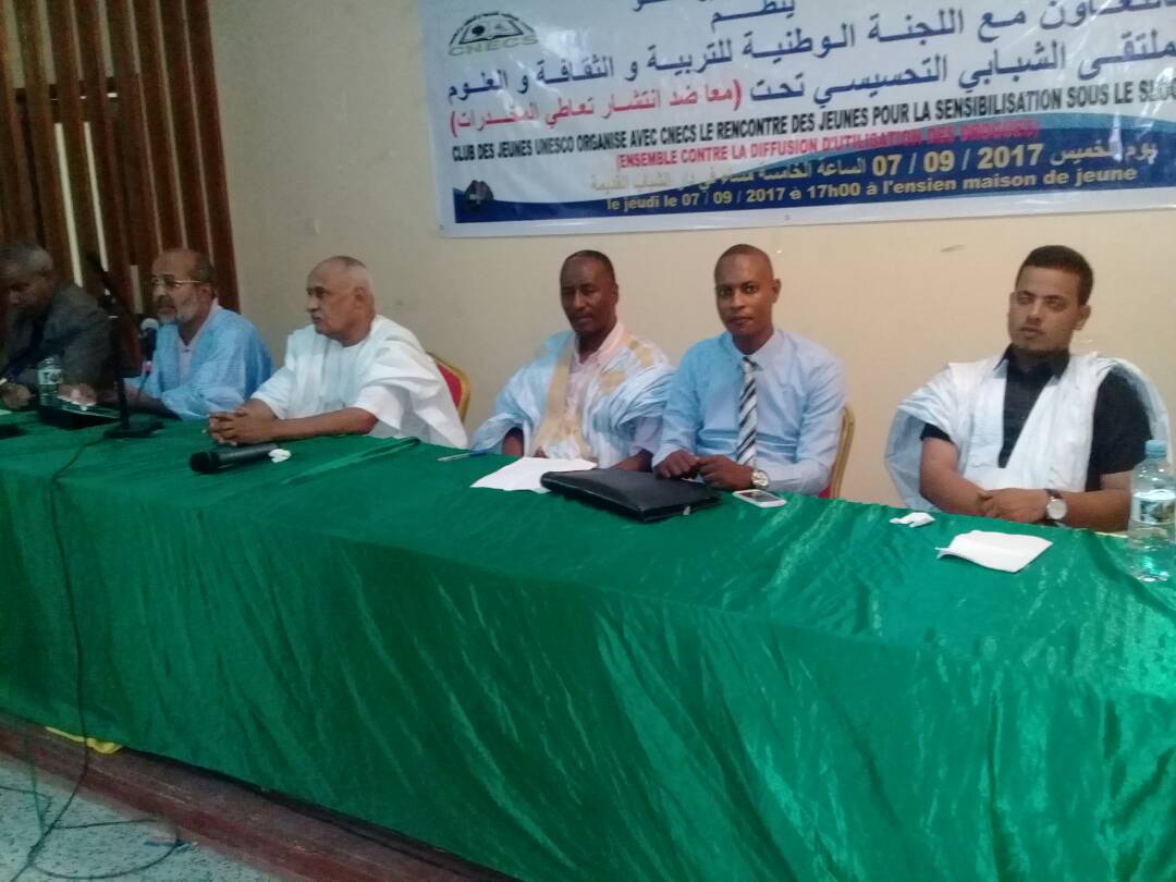 نظم نادي شباب اليونيسكو ندوة ثقافية بالتعاون مع اللجنة الوطنية للتربية والثقافة و العلوم تحت عنوان : ” الملتقى الشبابي التحسيسي ضد انتشار تعاطي المخدرات “، سيد محمد ول شغالي الأمين العام للنادي القى كلمة بالمناسبة تطرق خطورة انتشار المخدرات وتأثيراتها على صحة الإنسان و ما تسببه من مشاكل اجتماعية كبيرة و تهديد للأمن و الإستقرار.