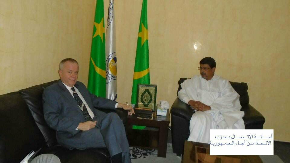 وتأتي زيارة سفير الولايات المتحدة الأمريكية لرئيس الحزب في إطار مراسيم انتهاء مهامه الدبلوماسية في بلدنا ، وبهذه المناسبة تقدم سعادة سفير الولاية المتحدة بخالص الشكر وعظيم الامتنان لرئيس الحزب الأستاذ سيدي محمد ولد محم على ما خصه به من احترام وتقدير وتشاور خلال الفترة التي قضاها في بلدنا..