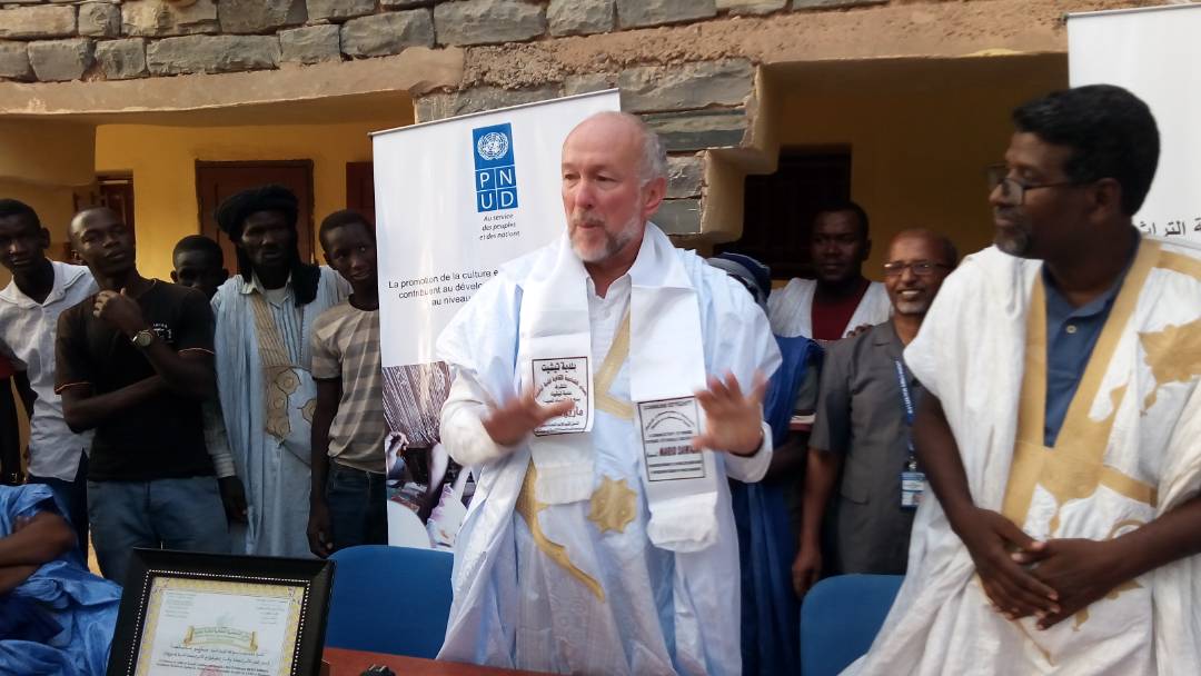 وشكر الوفد الذي تشجم عناء رحلة شاقة إلى المدينة الأثرية حيث حضر إلى جانب الممثل المقيم لبرنامج الامم المتحدة السيد ساماجا وفد دبلومسي أوربي هام يتقدمه السفير الإٍسباني سعادة خيسوس أخناثيو سانتوس، والسيد كريستيان هانس مدير التعاون في ممثلية الاتحاد الأوروبي، و السيد نبيل قنصل هولندا وبلجيا ولكسمبورغ” بليكس”، السيد بنوا مستشار بالسفارة الفرنسية، والسيد بول ممثل التعاون الإيطالي في موريتانيا، والسيد شيخنا حيدرا المكلف بالاتصال في برنامج الأمم المتحدة الإنمائي PNUD.