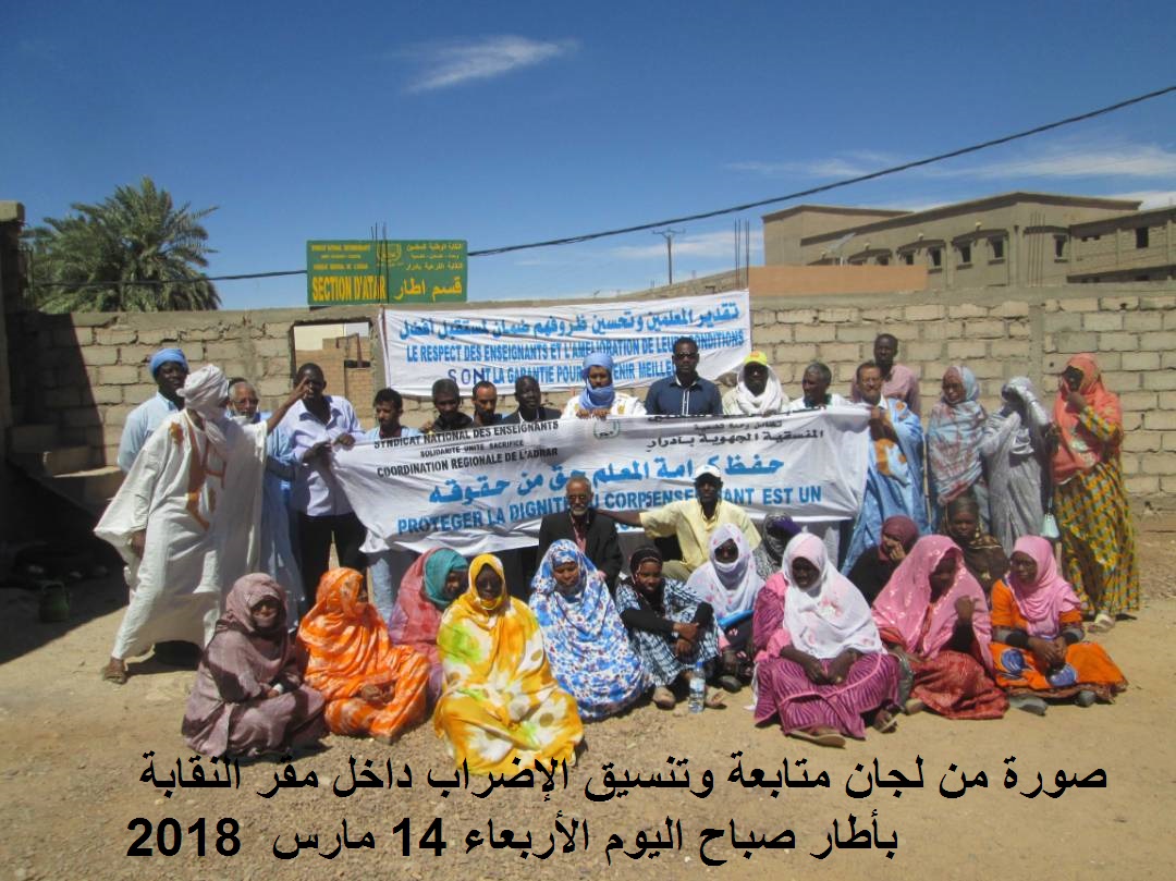 الأربعاء 21 مارس كان يوم إضراب متزامن وبتنسيق محكم بين هيئات النقابة الوطنية للمعلمين في أطار وتجكجة والرشيد والقدية والمجرية ولحويطات حيث بلغت نسبة اﻻضراب أزيد من 90% فى العديد من مراكز وتجمعات الوﻻيتين