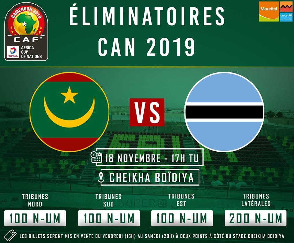 أعلنت الاتحادية الموريتانية لكرة القدم بدء بيع تذاكر مباراة المنتخب الوطني مع بوتسوانا، اليوم الجمعة وغدا السبت في نقطتين أمام ملعب شيخا بيديا.