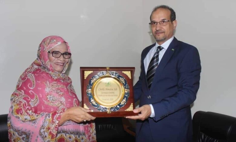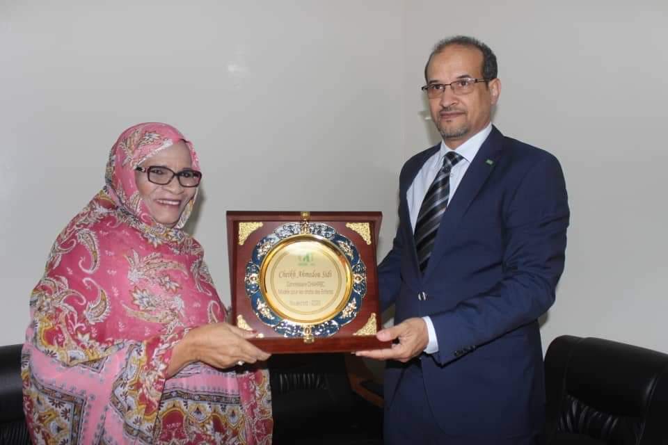 تسلم معالي مفوض حقوق الإنسان و العمل الإنساني و العلاقات مع المجتمع المدني السيد الشيخ احمدو ولد أحمد سالم ولد سيدي الاربعاء بمكتبه من السيدة زينب بنت الطالب موسي رئيسة منظمة صحة الام و الطفل درع نموذج لحقوق الطفل لسنة 2022 .