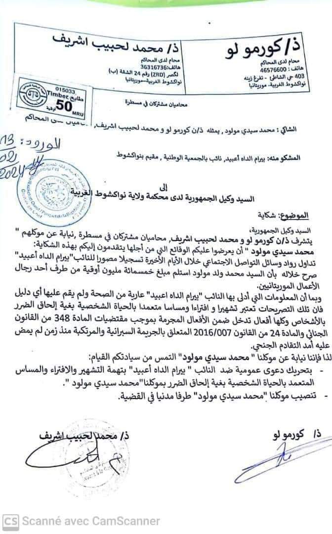 وقال ولد مولود في الشكاية التي قدمها باسمه المحاميان كورمو لو، ومحمد الحبيب اشريف إن المعلومات التي أدلى بها ولد اعبيدي حول تلقي موكلهم مبلغ 500 مليون أوقية من رجل الأعمال محمد ولد بو عماتو خلال انتخابات 2019 “عارية من الصحة، ولم يقدم عليها أي دليل”.