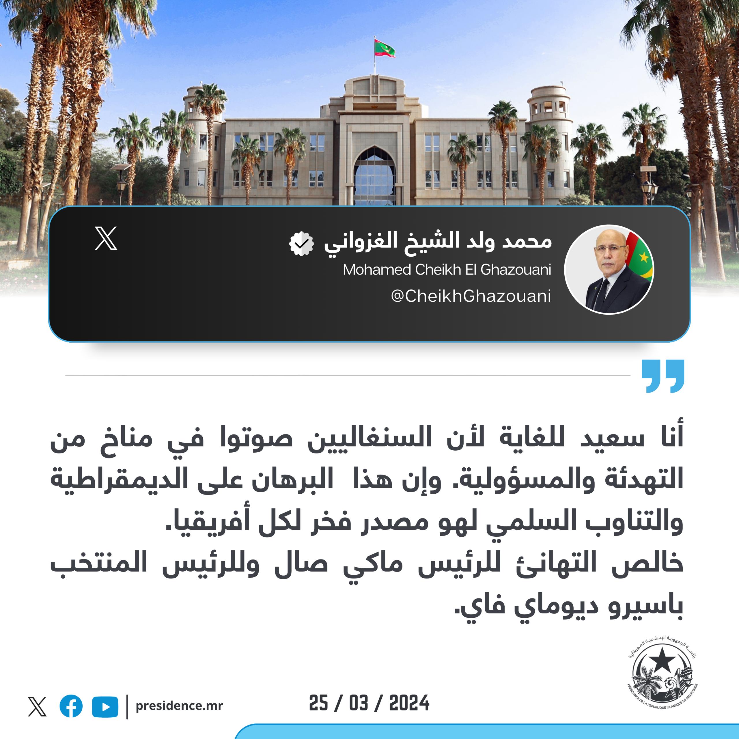 وهنأ غزواني في تغريدة على حساب الرئاسية في موقع إكس الرئيس السنغالي المنتخب بشير فاي، كما هنأ الرئيس المنصرف مكي صال على تنظيم هذه الانتخابات التي حملت مرشح المعارضة لسدة الحكم.